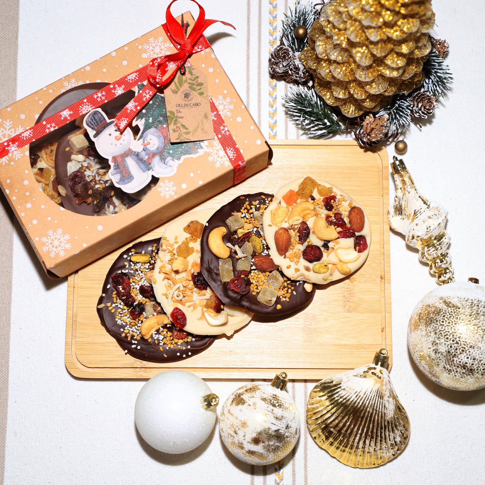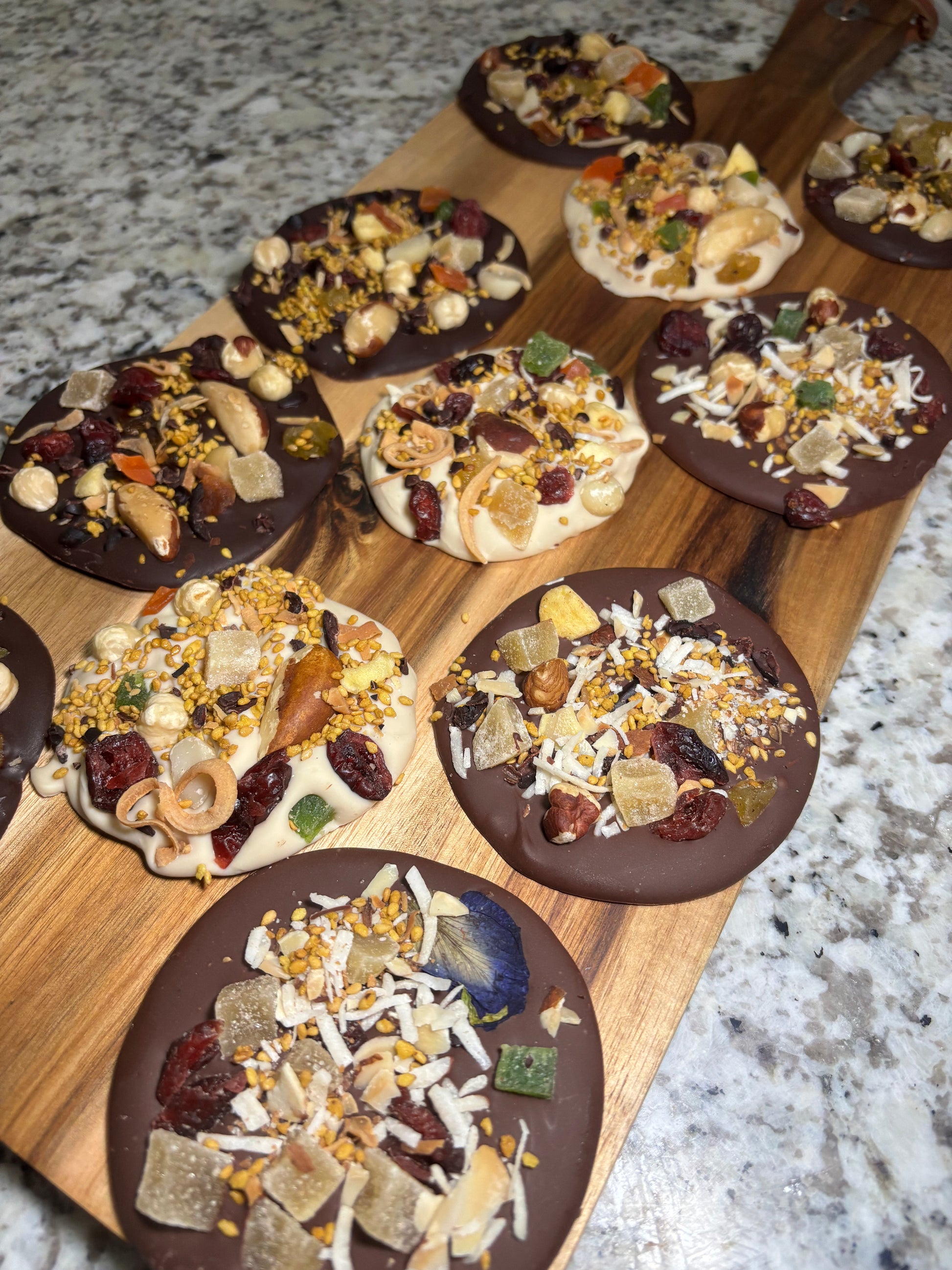 Prueba el exquisito sabor de nuestros mendiants elaborados con chocolate oscuro, con leche o blanco, decorados con una selección de frutos secos y nueces. Disfruta una experiencia deliciosa y nutritiva que te brindará energía y satisfacción. Precio por unidad.